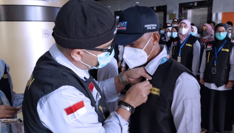 TIMES Jombang/Kapuskes Haji Kemenkes Budi Sylvana saat menyematkan pin kepada petugas kesehatan haji. (FOTO: dok. Kemenkes)