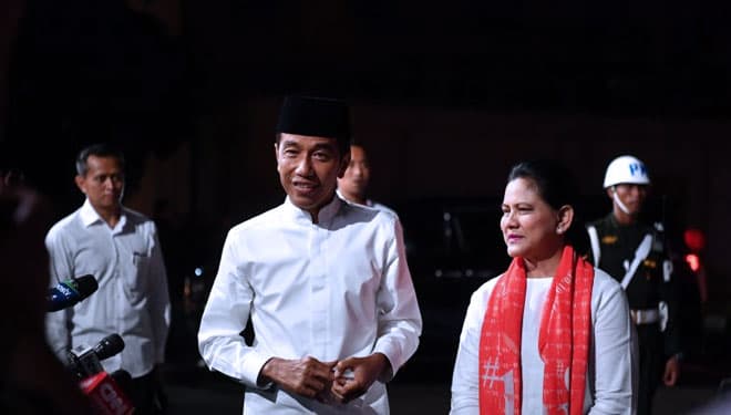 TIMES Jombang/Capres nomor urut 01 Joko Widodo bersama istri Iriana Joko Widodo tiba di lokasi untuk mengikuti debat Pilpres 2019 putaran kelima, di Hotel Sultan, Jakarta, Sabtu (13/4/2019). (FOTO: Rivan Awal Lingga/Antarafoto)
