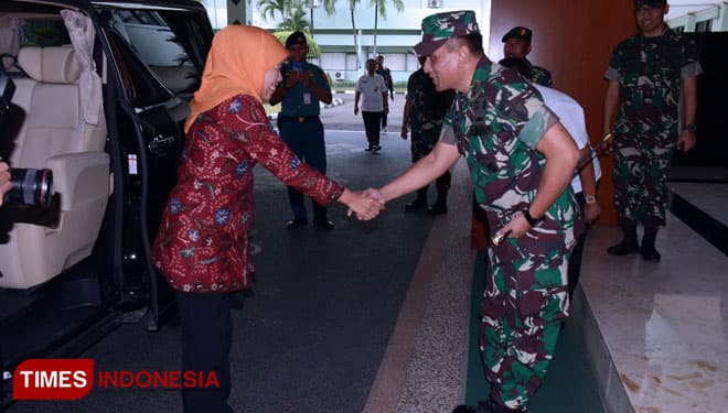TIMES Jombang/Pangdam V/Brawijaya, Mayjen TNI Wisnoe, P.B, menyambut kedatangan Gubernur Jatim, Khofifah Indar Parawansa di Makodam V/Brawijaya, Rabu (20/2/2019).(Foto: Istimewa)